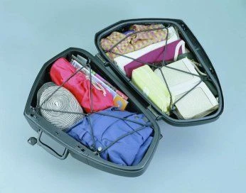 Elastische banden helpen de bagage binnen in de zijkoffer vast te houden. Inclusief een centrale haak en 4 haken voor veilig vastbinden. Set voor 1 zijkoffer (2 banden).